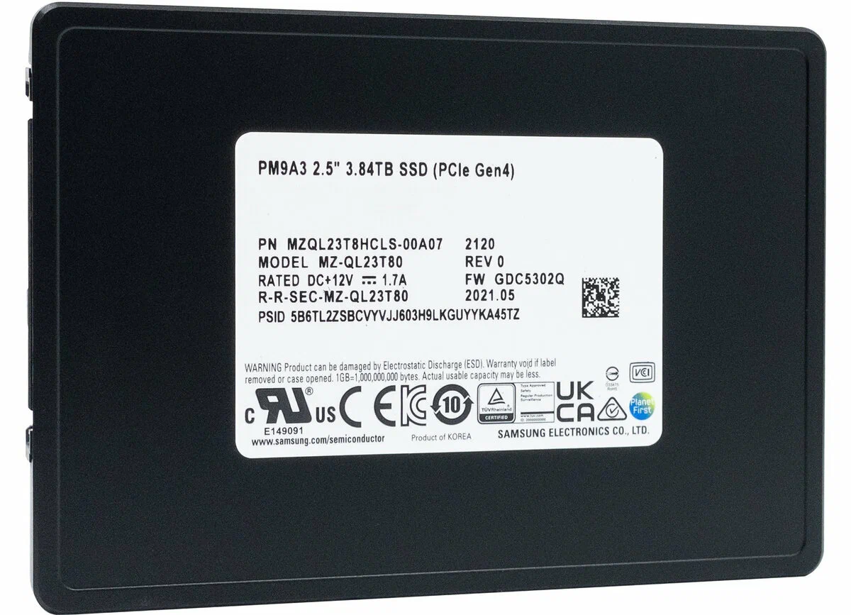 Одной из ключевых особенностей Samsung PM9A3 является его форм-фактор 2.5" с интерфейсом U.2, что обеспечивает удобную интеграцию в современные серверные и корпоративные системы. Поддержка NVMe позволяет полностью раскрыть потенциал высокоскоростных SSD, значительно ускоряя обработку данных по сравнению с традиционными SATA-накопителями.